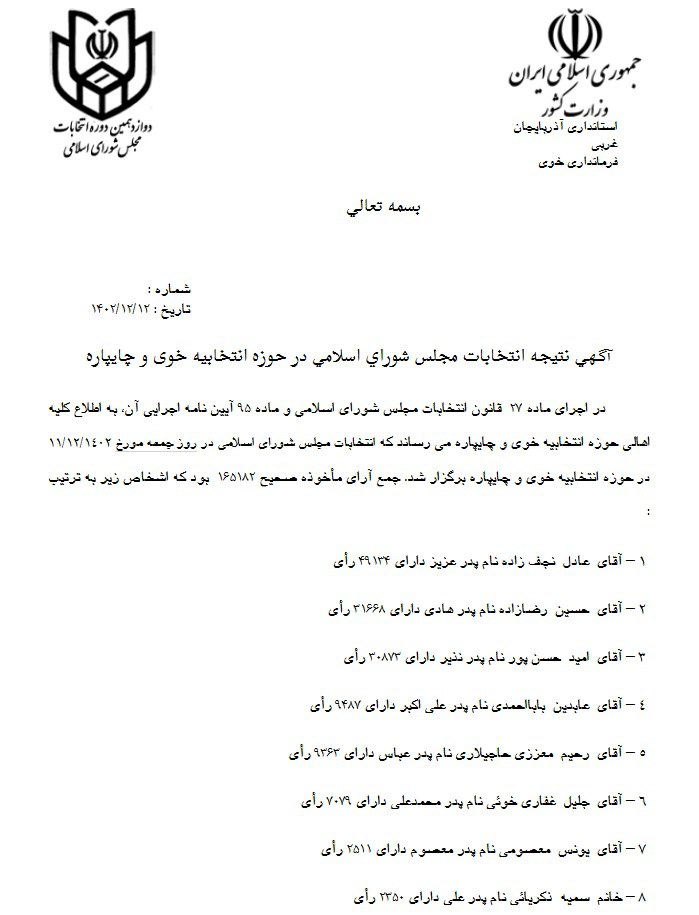 از میان ۱۶۵ هزار و ۱۸۲ رای ماخوذه صحیح در حوزه شهرستانهای خوی و چایپاره، عادل نجف زاده با ۴۹ هزار و۱۳۴ رای به عنوان نماینده مردم خوی و چایپاره در دوازدهمین دوره مجلس شورای اسلامی انتخاب گردیده و آقایان حسین رضازاده با ۳۱ هزار و ۶۶۸ رای در جایگاه دوم و امید حسینپور با ۳۰ هزار و ۸۷۳ رای در جایگاه سوم قرار گرفتند.