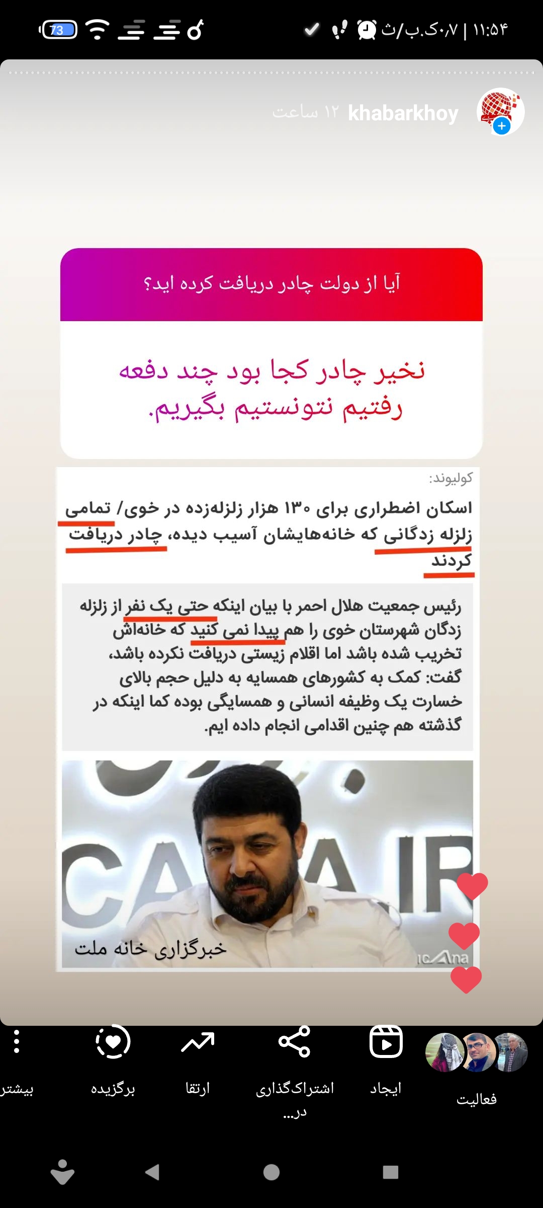 بخشی از نظرات ارسال شده مردم زلزله زده خوی به پیج اینستاگرام “حامیان خوی” :